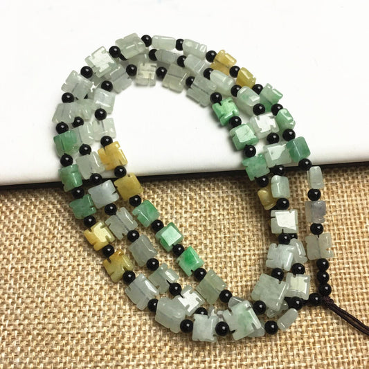 Zertifizierter natürlicher Jadeit der Güteklasse A, schwarzer Achat, handgeschnitzte Halskette, Mädchenkette, runde Perlengröße: 7 x 7 mm, grüner Edelstein aus Burma