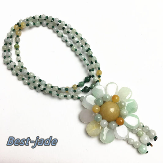 Certificated Flower Grade A Natural Jade et Hand carved Necklace Chain Jadeite Round bead gemstone Type A stone
