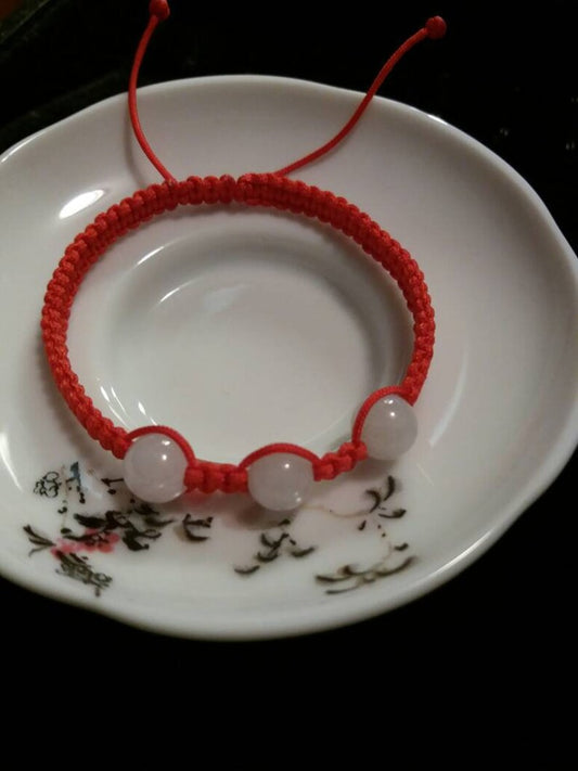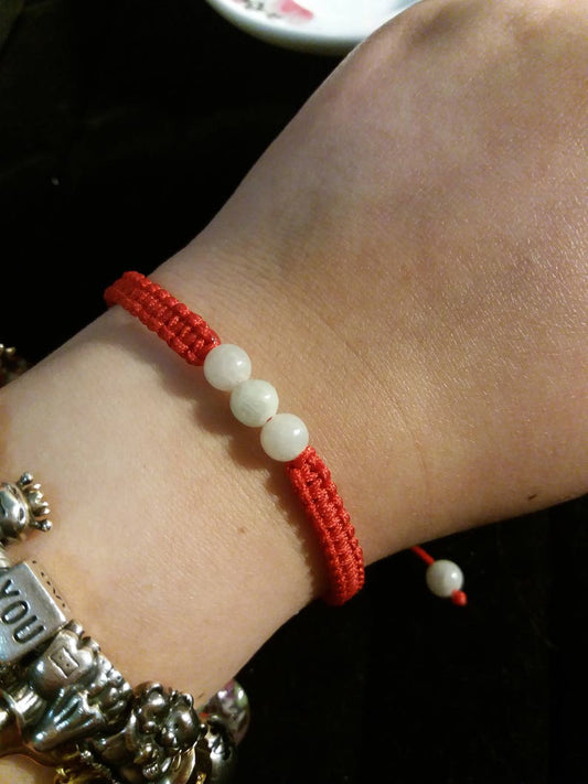 Chinese Red String Rope Thread Bracelet with Three Natural Burmese White Jadeite Jade Beads